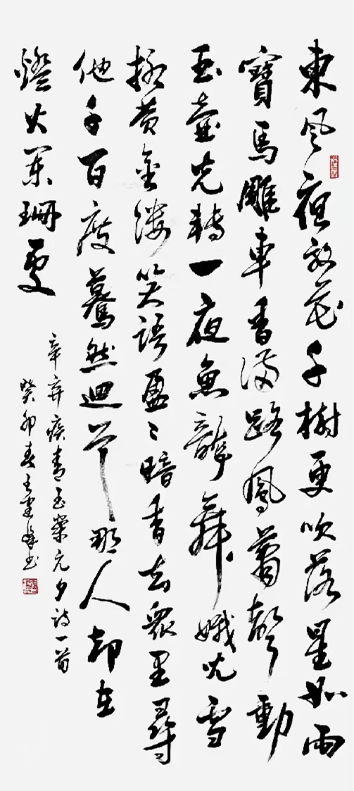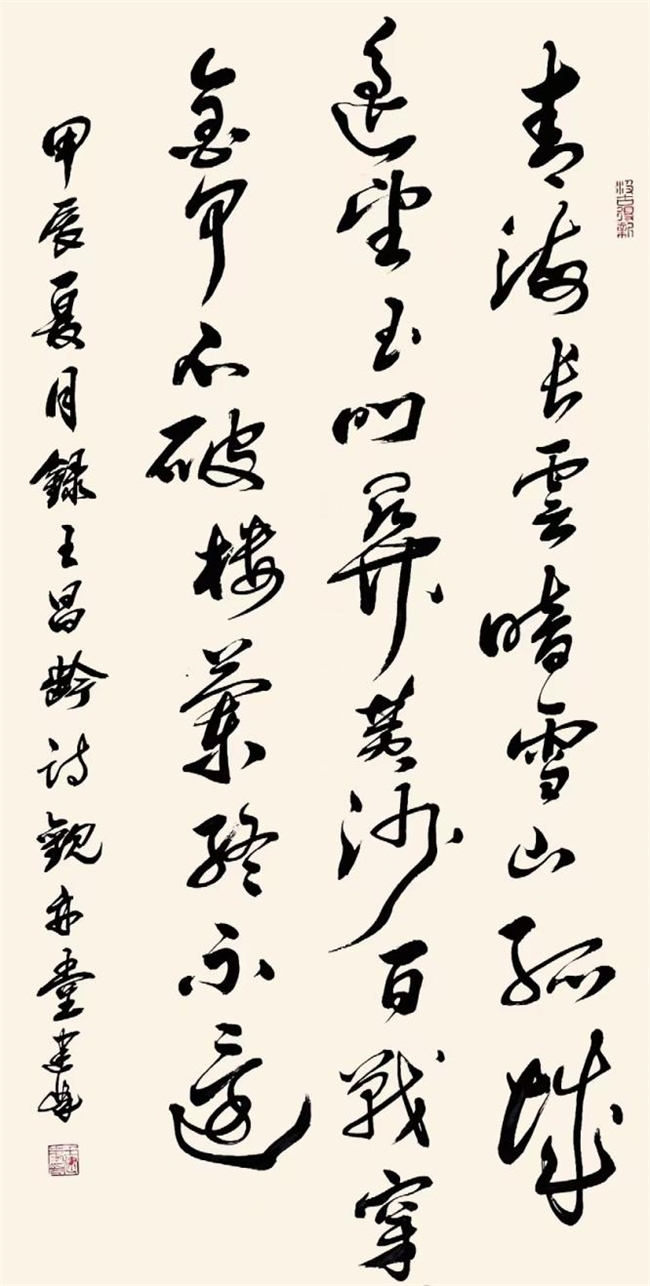 作品:王昌龄《从军行七首•其四》诗。2021年12月被广州市第五届《红棉杯书法篆刻大赛》评为入选作品。2024年《书法报》第24期刋载。中堂