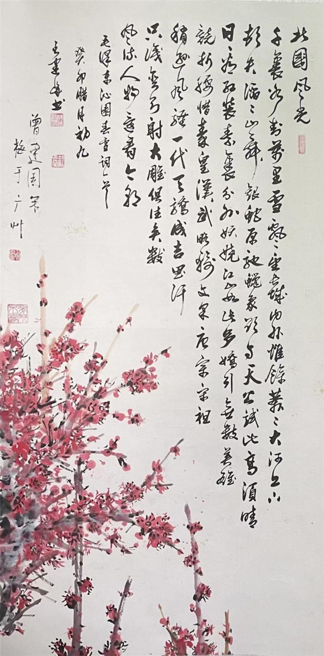 Work: Mao Zedong's poem "Qinyuan Chun • Snow" (Spring in the Garden • Snow), painted by Zeng Jianguo and calligraphed by Wang Jianfeng, measuring 138cm × 69cm.
