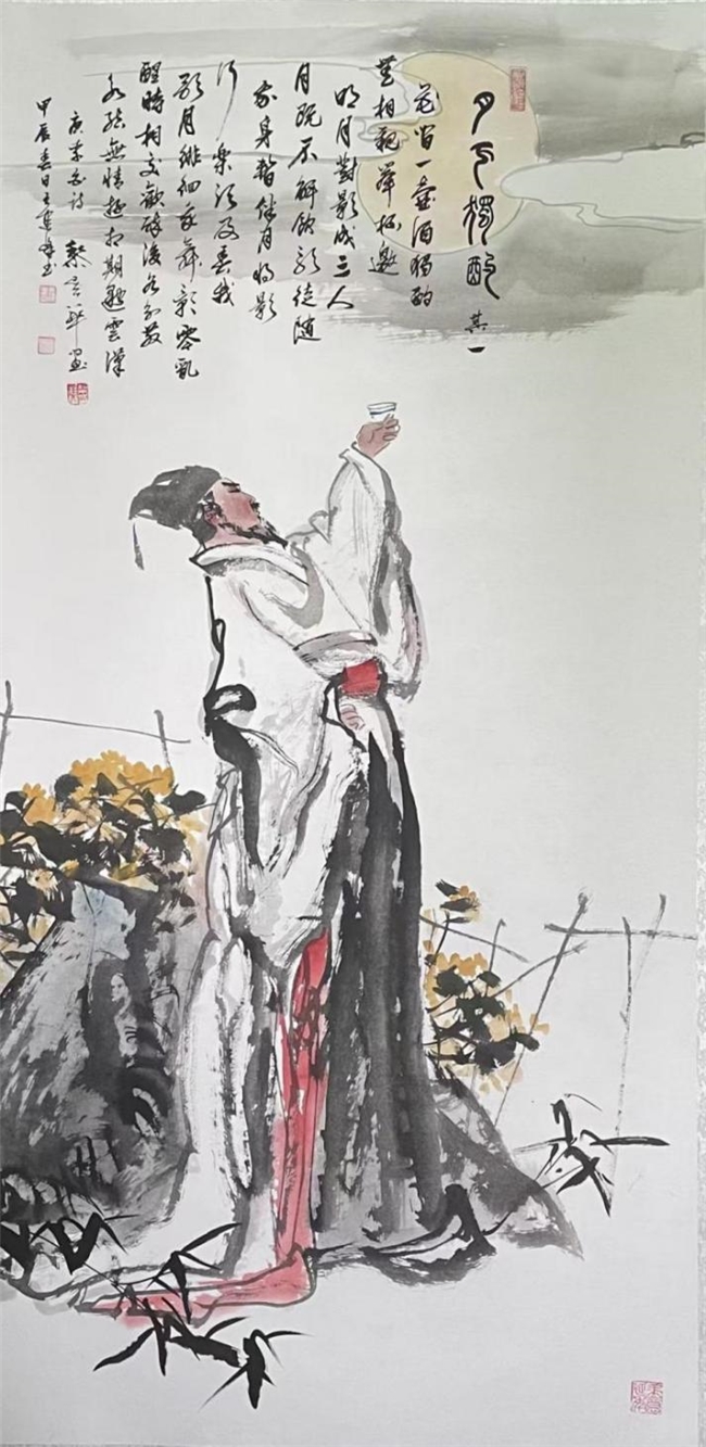 The artwork is Li Bai's poem "Drinking Alone under the Moon", published in the eighth issue of Calligraphy News on February 27,2024. It features a painting by Li Zhanhua and calligraphy by Wang Jianfeng, measuring 180cm×70cm.