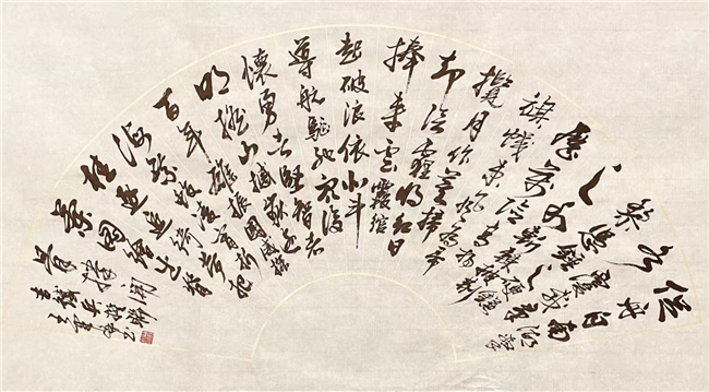 作品:《促舟 •破浪》楹联 / 吉铁兵撰联 / 扇面。2021 年 7 月 22 日广东楹联学会、广东省立中山图书馆举办,广东省“观音山杯”《百字百联庆建党百周年联墨展》百幅佳作。广东