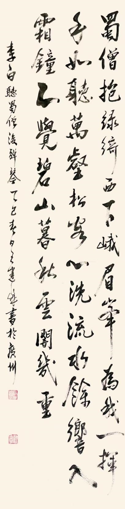 Work: A scroll painting of Li Bai's poem "Listening to Monk Jun from Shu Play the Zither", measuring 138cm × 35cm.