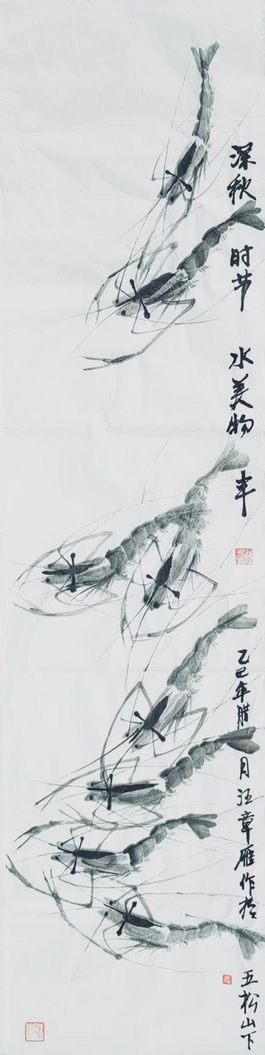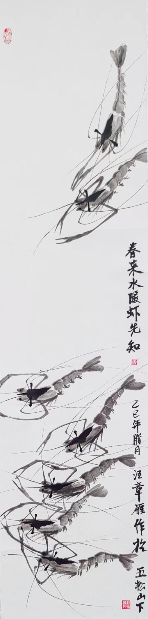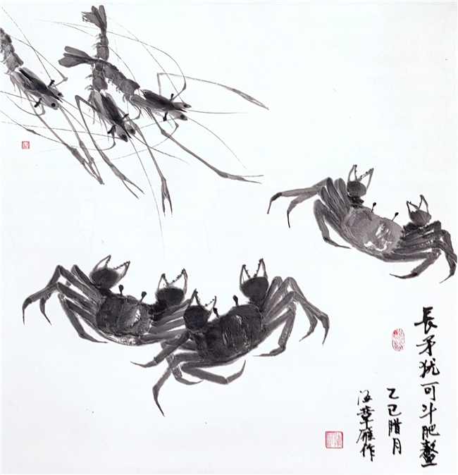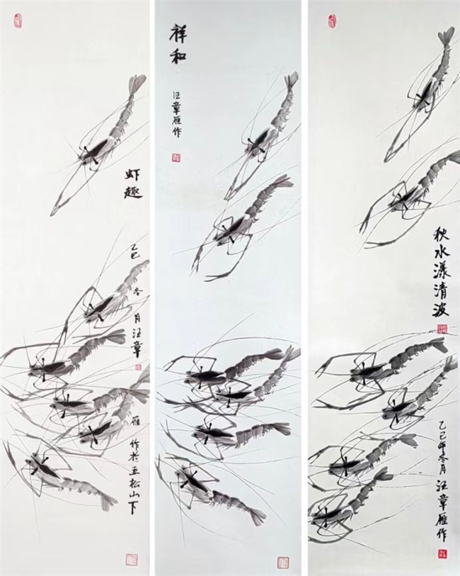 In addition to his profound mastery of landscape sketching in ink, Wang Zhangyan has also made significant contributions in the creation of ink paintings featuring crabs and shrimps. He draws inspiration from tradition while presenting his own unique ideas. He adheres to the principle of "learning from predecessors and then creating anew", and delves into nature to observe the dynamic expressions of aquatic creatures. Using a firm brushstroke and integrating calligraphy into painting, he depicts the agility and transparency of the shrimps and the earthy and rich texture of the crabs. The shrimps in his works have a gentle yet powerful appearance, with their antennae swaying gracefully, as if the water is flowing. The shrimps call and respond to each other, enjoying a carefree and contented state. The crabs in his paintings have a thick ink color and a rustic charm. The group of crabs and shrimps either swim side by side, or keep their heads and tails close together, or move in and out, creating a natural arrangement that fully showcases the dynamic, static, gathering, and dispersing beauty of aquatic creatures. This also reflects the ecological philosophy of "harmony and coexistence". His ink paintings of shrimps and crabs are concise in brushwork, natural and lively, and full of vitality. They are a vivid continuation and individual expression of traditional freehand flower-and-bird painting in the contemporary era.