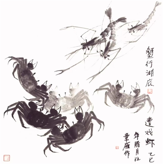 除了风景写生水墨的深厚造诣,汪章雁在水墨虾蟹题材创作上亦有独到建树,师法传统而自出新意。他坚守“师古人更师造化”的理念,深入自然观察水族生灵的动态神情,以中锋运笔、以书入画,用凝练清雅的笔墨,绘出虾之灵动通透、蟹之苍润厚重。笔下之虾,水墨淡雅、气韵生动,虾须柔中见劲、摇曳生风,仿若清水涌动,群虾相呼相应、悠然自得;笔下之蟹,墨色厚重,朴拙有趣;群虾组蟹,或并肩同游、或首尾相顾、或穿插避让,错落天成,尽显水族本能的动、静、聚、散之美态,暗合“和谐共生”的生态哲思。他的水墨虾蟹作品笔墨简练、灵动自然、极富生命活力,是传统花鸟写意在当代的鲜活延续与个性表达。